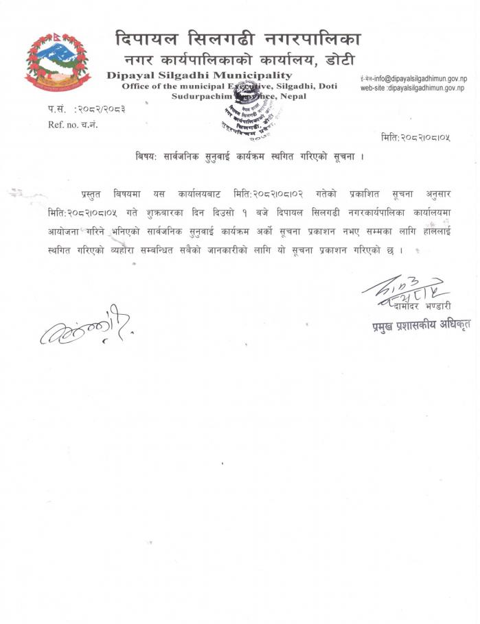सार्वजनिक सुनुवाई कार्यक्रम स्थगित गरिएको सूचना ।