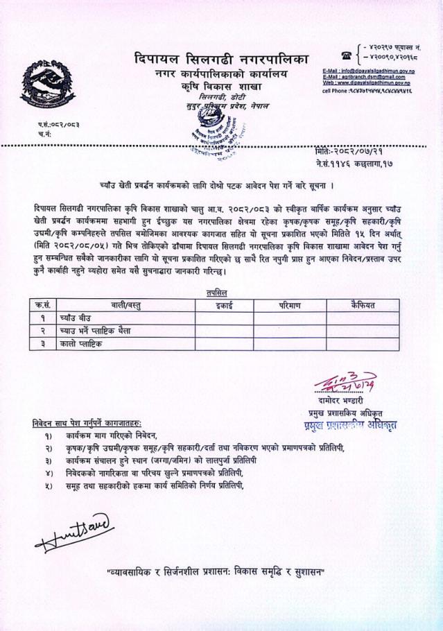 च्याँउ खेती प्रवर्द्धन कार्यक्रमको लागि दोश्रो पटक आवेदन पेश गर्ने बारे सूचना ।