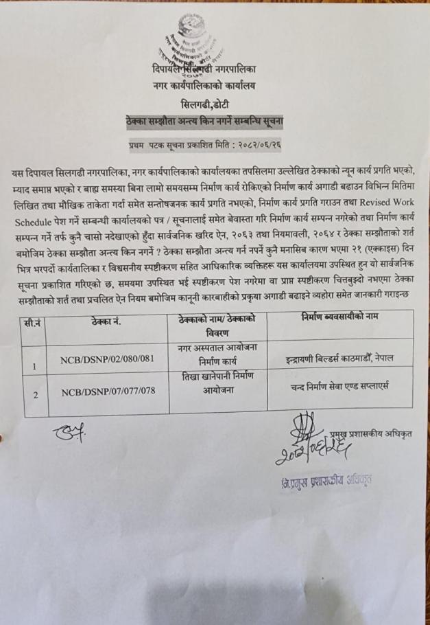 ठेक्का सम्झौता अन्त्य किन नगर्ने सम्बन्धी सूचना