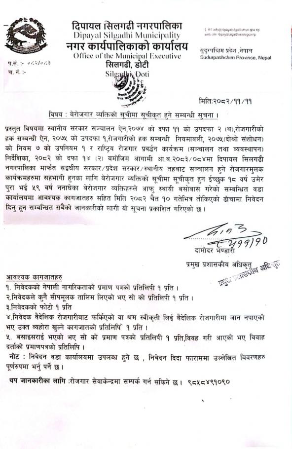 बेरोजगार व्यक्तिको सूचीमा सूचीकृत हुने सम्बन्धी सुचना ।