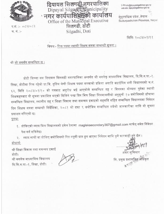 » मगलेक मा.वि.को रिक्त पदमा स्थायी शिक्षक सरुवा सम्बन्धी सूचना ।