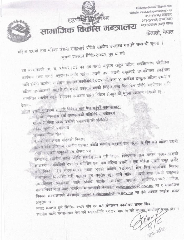 » महिला उद्यमी तथा महिला उद्यमी समूहलाई प्रविधि सहयोग उपलब्ध गराउने सम्बन्धी सूचना ।